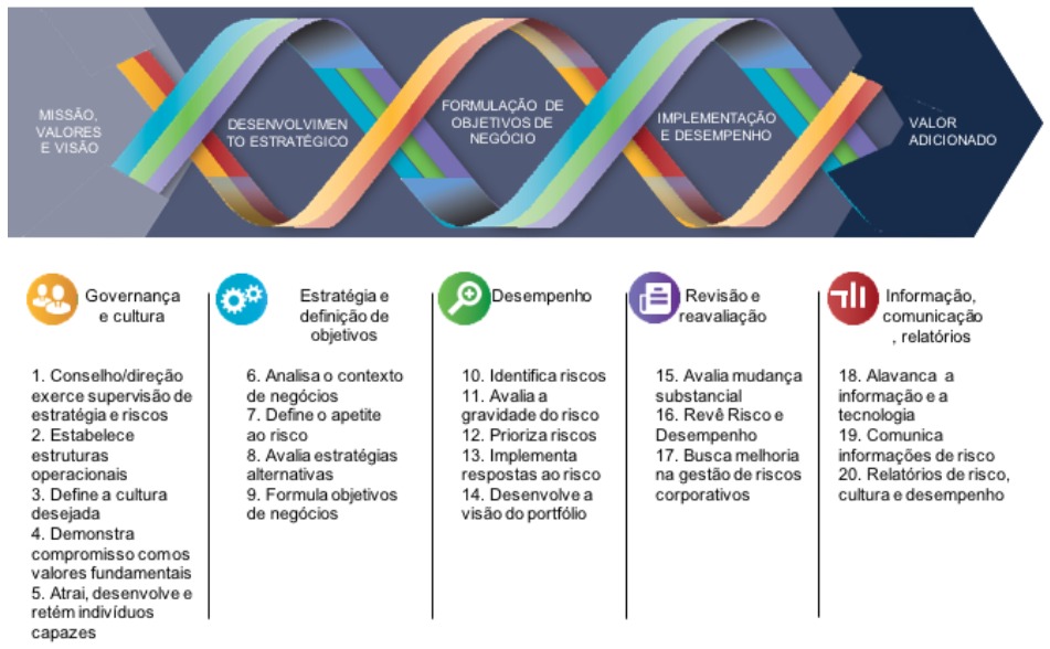 Em outras palavras, a cultura é o estabelecimento da missão, visão e valores da empresa. As decisões das pessoas afetam os riscos. Quanto aos recursos citados, a ERM auxilia a entidade a se adaptar às mudanças do mercado por meio da antecipação de alguns eventos/riscos e também a cumprir a missão e a visão da entidade. Além disso, a ERM se integra nas atividades diárias, em alto nível organizacional, com a definição da estratégia.