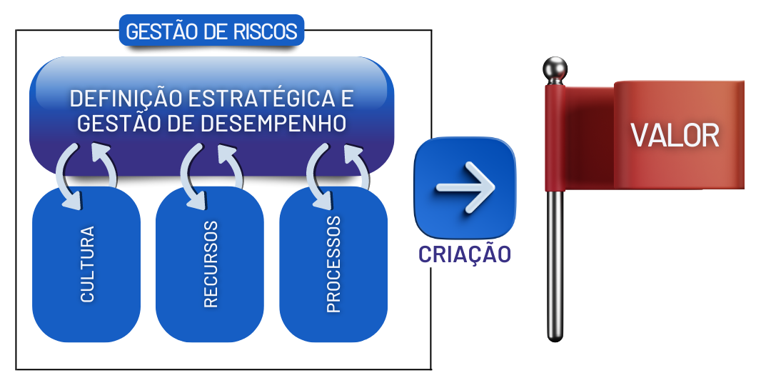 A definição de ERM segundo o COSO (The Comitee of Sponsoring Organizations) é: “A cultura, recursos e atividades integradas com a definição estratégica e gestão de desempenho, nos quais as empresas se baseiam para gestão de riscos enquanto criam valor”.
